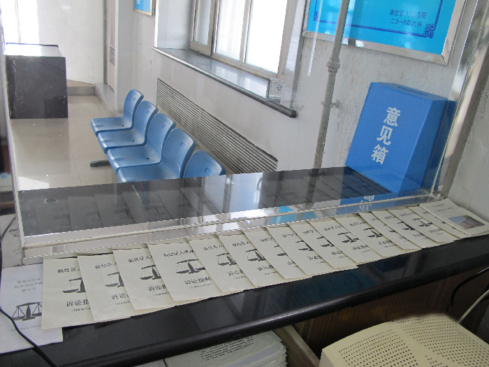 图为:南岔法院立案大厅一角,设置休息椅、意见箱、各种诉讼指引材料,为百姓诉讼提供便民服务。