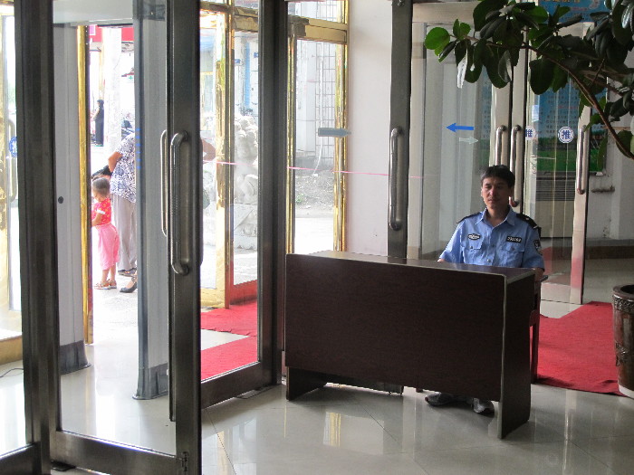为方便群众诉讼实行法警执勤工作制度。图为法警正在值勤,对来往群众进行安检、登记、诉讼导航,为群众提供法律服务。