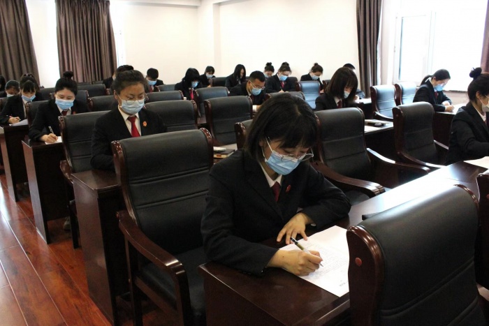 本次测试采用闭卷集中作答形式,共设置填空题、选择题、简答题三种题型,内容涵盖了习近平新时代中国特色社会主义思想、党的十九届六中全会精神等内容。全体干警严格谨守考场规则,认真思考、专心答题,顺利完成测试。