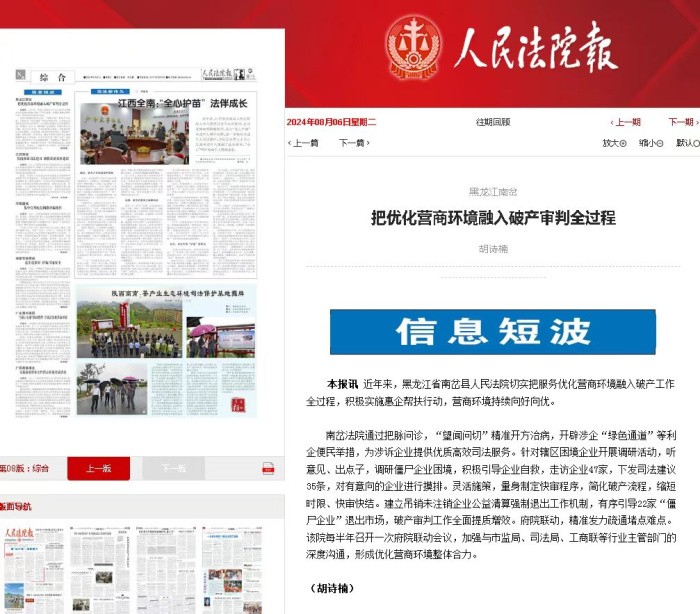 8月6日,《人民法院报》报道黑龙江省南岔县人民法院:把优化营商环境融入破产审判全过程。