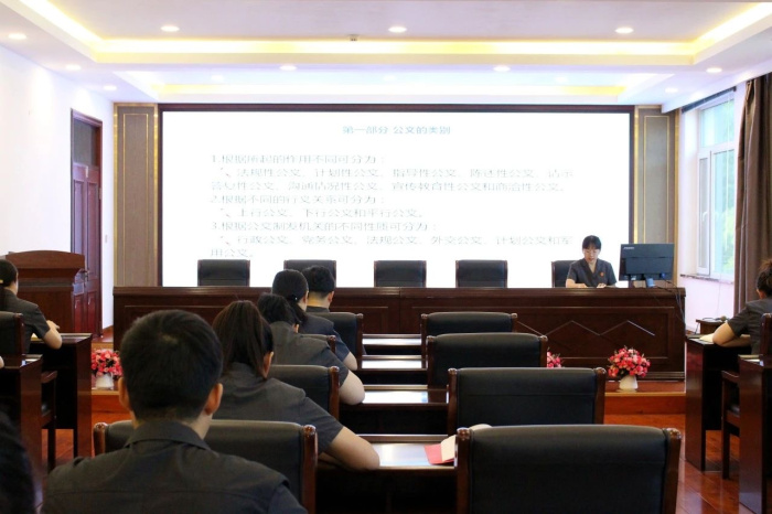 会上,工作人员结合自身工作经验,围绕公文的类别、文种的名称、公文的作用、公文的格式四方面讲解了常见公文写作知识,深入剖析了公文的写作技巧、格式要求及注意事项,并引用实际案例对公文写作不规范的现象、易混淆的词汇进行了纠正和解答。