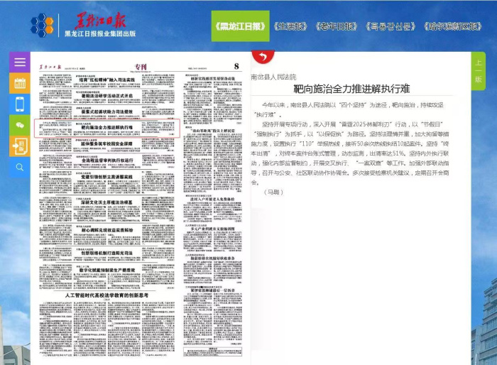 7月31日,《黑龙江日报》报道南岔县人民法院:靶向施治全力推进解执行难。