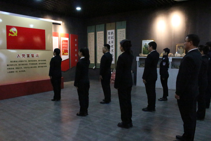 “我志愿加入中国共产党,拥护党的纲领……”在誓言厅,全体党员面向党旗,高举右手,庄严宣誓,重温入党誓词,铭记初心使命,永葆共产党员的政治本色。